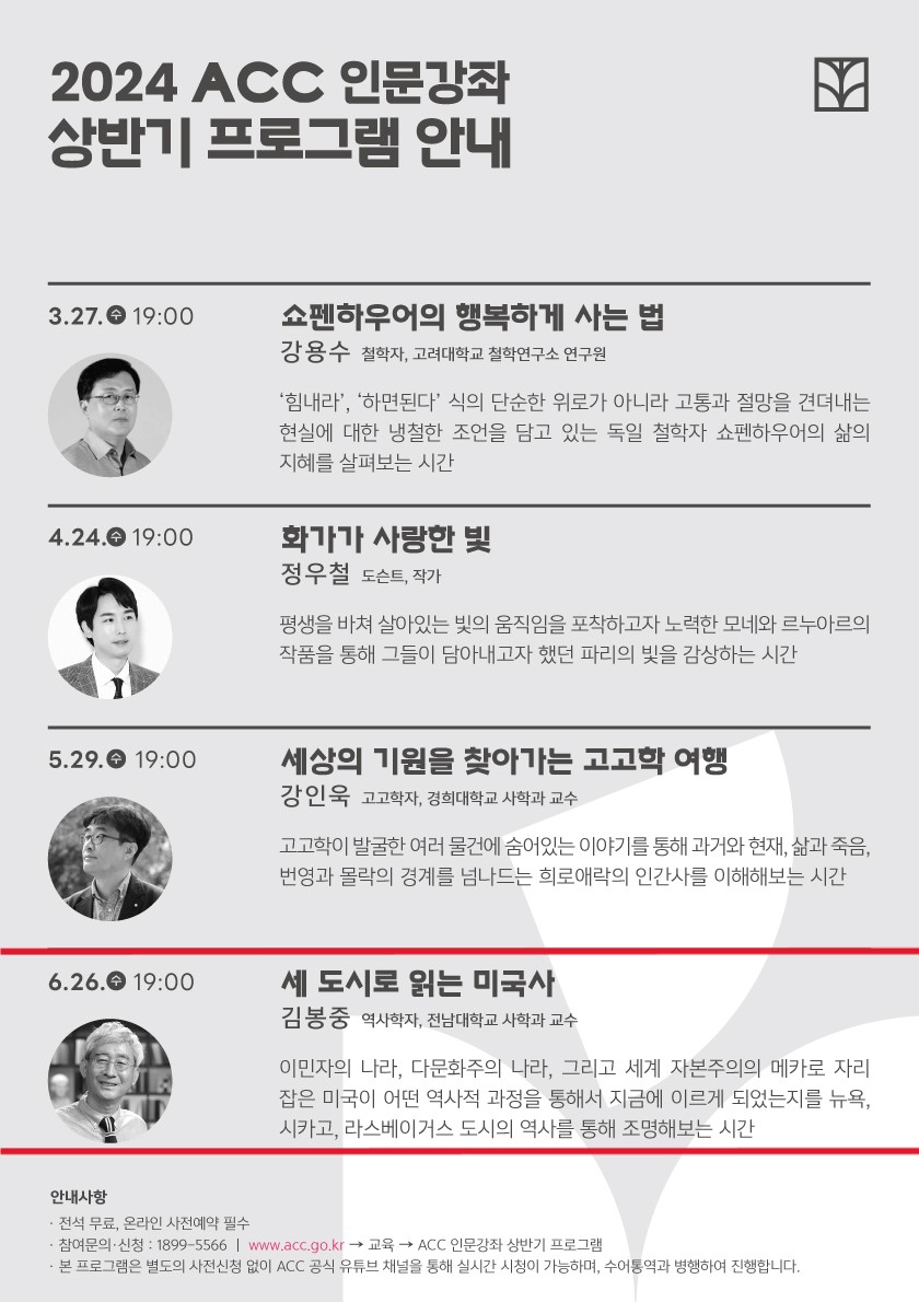 ACC Àι®°Á´ ¹®ÈÀü´çÀÇ ÇÙ½ÉÅ׸¶¸¦ ¹ÙÅÁÀ¸·Î µ¿½Ã´ë ¹®È Æ®·£µå¸¦ ¹Ý¿µÇÑ Ä¿¸®Å§·³À» ÅëÇØ ´Ù¾çÇÑ ºÐ¾ßÀÇ Àü¹®°¡¸¦ ¸¸³ª º¼ ¼ö ÀÖ´Â ¼ºÀÎ ´ë»ó ´ëÁß°¿¬ ÇÁ·Î±×·¥ÀÔ´Ï´Ù¿ÃÇØ »ó¹Ý±â 4Â÷·Ê ÇÁ·Î±×·¥ Áß 6¿ùÀº '¹Ì±¹»ç'¸¦ ÁÖÁ¦·Î ÁøÇàµË´Ï´Ù¡ã ¼¼ µµ½Ã·Î Àд ¹Ì±¹»ç - ±èºÀÁß°»ç(¿ª»çÇÐÀÚ, Àü³²´ëÇб³ »çÇаú ±³¼ö)À̹ÎÀÚÀÇ ³ª¶ó, ´Ù¹®ÈÁÖÀÇ ³ª¶ó, ±×¸®°í ¼¼°è ÀÚº»ÁÖÀÇÀÇ ¸ÞÄ«·Î ÀÚ¸® ÀâÀº ¹Ì±¹ÀÌ ¾î¶² ¿ª»çÀû °úÁ¤À» ÅëÇØ¼ Áö±Ý¿¡ À̸£°Ô µÇ¾ú´ÂÁö¸¦ ´º¿å, ½ÃÄ«°í, ¶ó½ºº£À̰Žº µµ½ÃÀÇ ¿ª»ç¸¦ ÅëÇØ Á¶¸íÇØº¸´Â ½Ã°£ ¡ã ±â°£ - 2024³â 6¿ù26ÀÏ ¼ö¿äÀϡ㠽ð£ - 19:00~20:30(90ºÐ)¡ã Àå¼Ò - ±¹¸³¾Æ½Ã¾Æ¹®ÈÀü´ç ¹®ÈÁ¤º¸¿ø B3 ±ØÀå3 ¹× ¿Â¶óÀΡ㠽Åû±â°£ - 2024³â 6¿ù 4ÀÏ 10:00 ¡ã 6¿ù ÇÁ·Î±×·¥ ' ¼¼ µµ½Ã·Î Àд ¹Ì±¹»ç'´Â ¹®ÈÀü´ç °ø½Ä À¯Æ©ºê ä³ÎÀ» ÅëÇØ ½Ç½Ã°£ ½ÃûÀÌ °¡´ÉÇÕ´Ï´Ù(±¹¸³¾Æ½Ã¾Æ¹®ÈÀü´ç À¯Æ©ºê ä³Î Á¢¼Ó - LIVE(¶óÀ̺ê)·Î ½Ãû